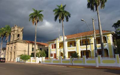 Prefeitura municipal e Igreja matriz (construída em 1931), em pleno Pantanal do Mato Grosso